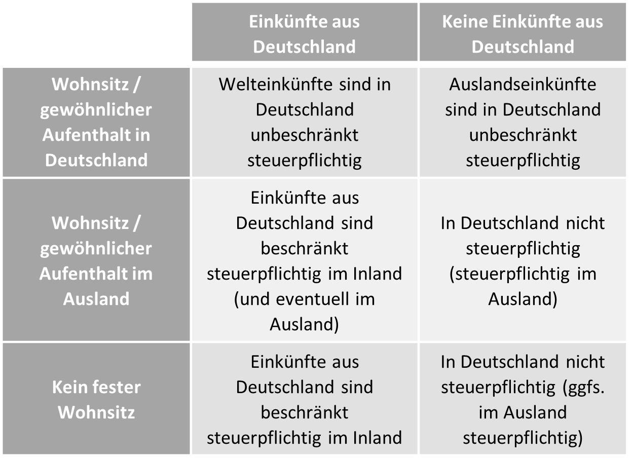Grundsätzlich gilt, wer in Deutschland einen Wohnsitz oder einen gewöhnlichen Aufenthalt hat, unterliegt mit seinem Welteinkommen der unbeschränkten Einkommensteuerpflicht in Deutschland.